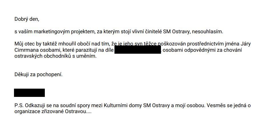 „Mám problém s tím, že město Ostrava, které má účast v několika kulturních příspěvkových organizacích, porušuje moje práva. Pořádá divadelní představení bez licenčního souhlasu autorů a zatajuje, kdo je skutečným provozovatelem,“ uvedl Filip Smoljak pro Okraj.