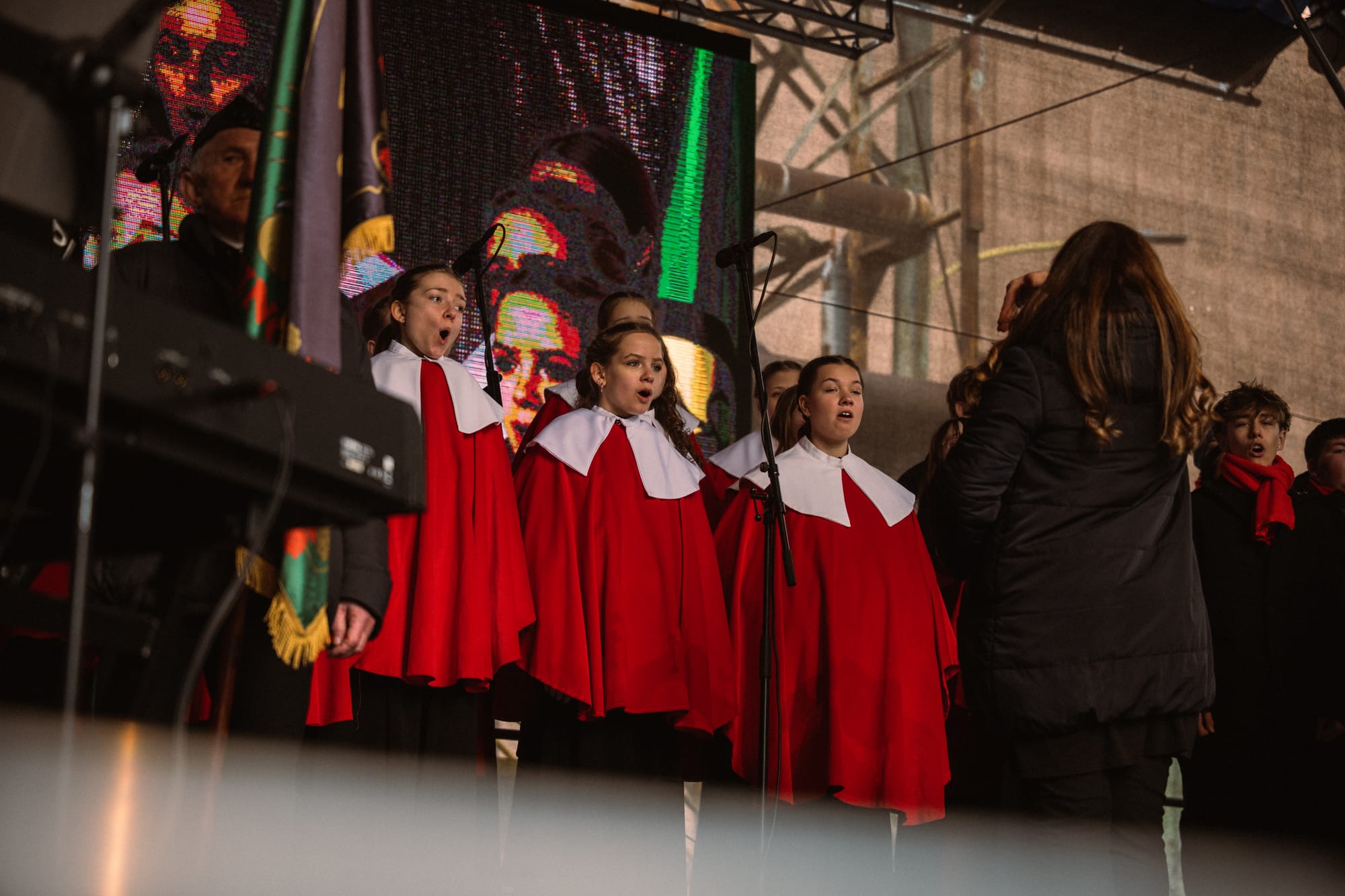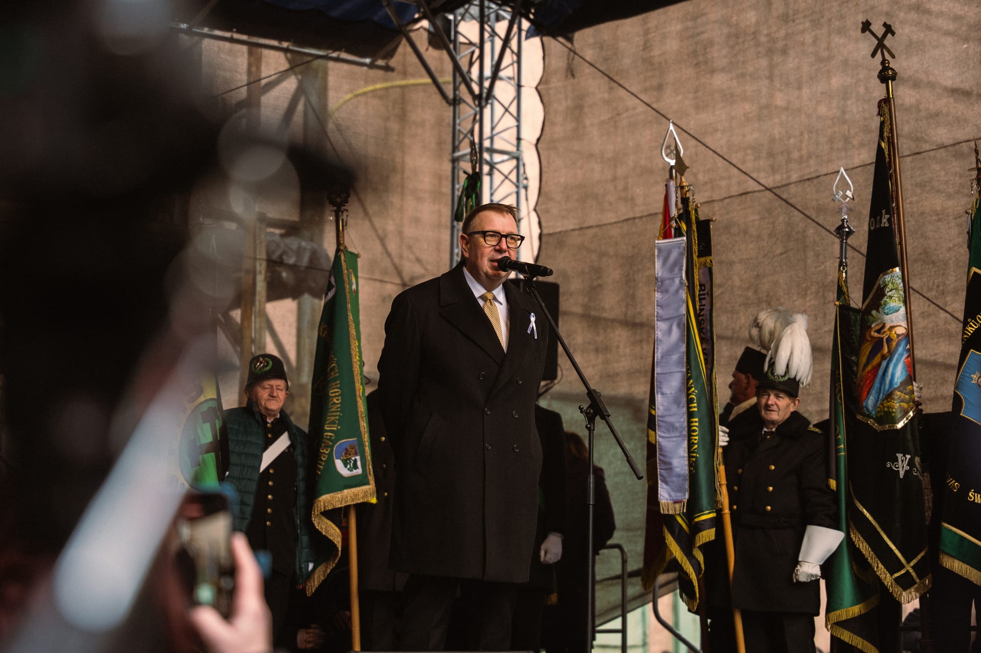 „Nás už nic nezaskočí, budeme žít tím, co už nemáme,“ zakončil báseň v polštině básník a horník Wojtek Tylka (vlevo nahoře). Součástí ceremoniálu bylo dekorování praporů hornických měst (uprostřed nahoře) - zdobí se stužkami, včetně stužek ke konci těžby. Ceremoniálu se zúčastnil i ministr práce a sociálních věcí Aleš Juchelka (ANO, vpravo nahoře).