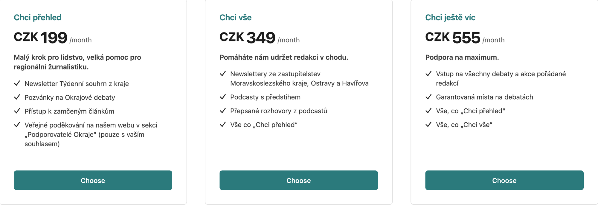 Od září zavádíme nový systém předplatného. Věříme, že je přehlednější a bude vám jasnější, co za svou podporu získáte. Vybrat si můžete ze tří úrovní – pro ty, kteří chtějí jen přehled, pro ty, kteří chtějí všechno, nebo pro ty, kteří chtějí ještě víc. Každá varianta přináší jiné výhody – od newsletterů přes podcasty až po vstupy zdarma na naše debaty a akce. Texty, které budou vznikat díky podpoře ze získaných grantů, si u nás stále přečtete i bez předplatného.