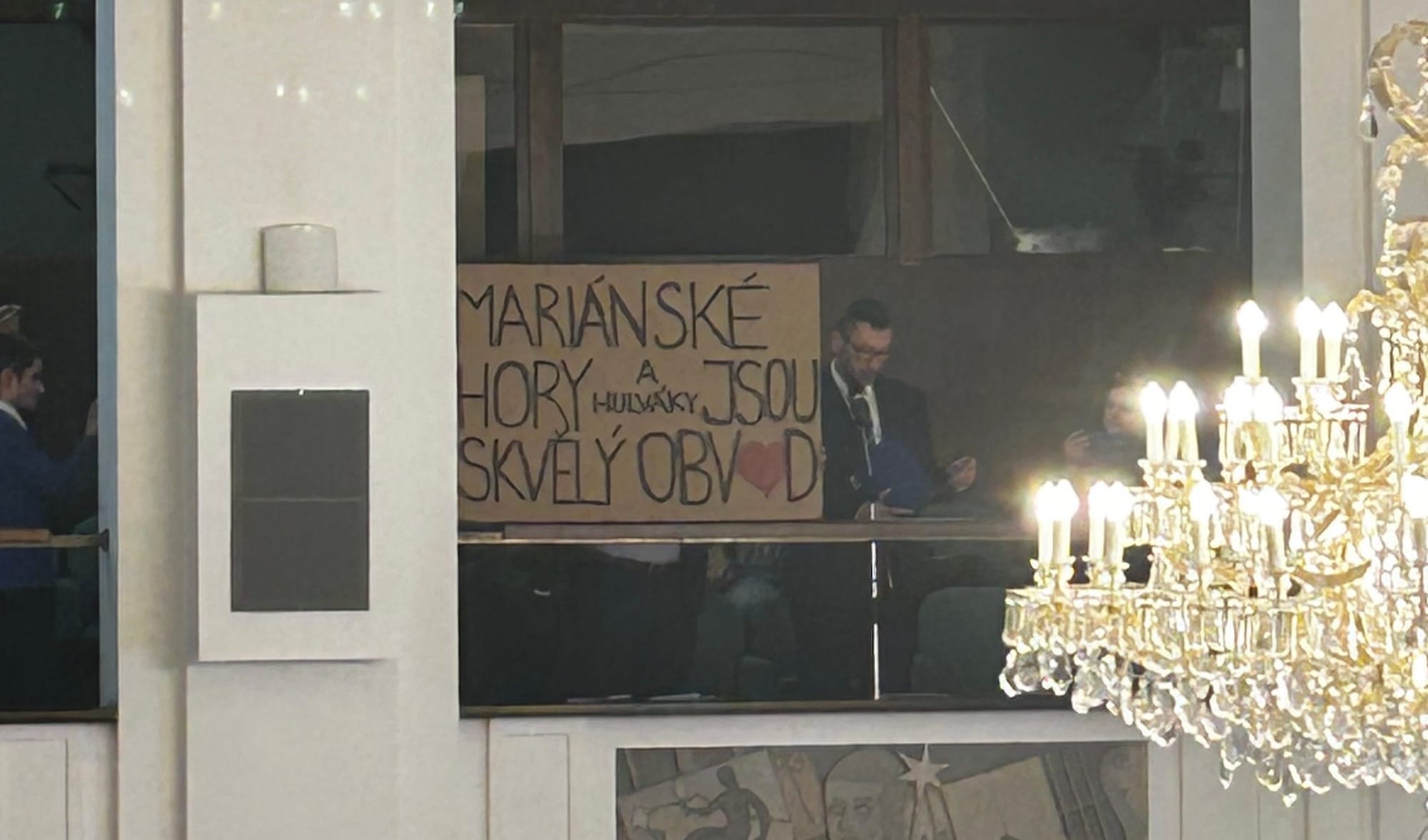 Starosta Mariánských Hor a Hulváků při jednání ostravského zastupitelstva vstal a odešel s kartonovou krabicí pryč ze sálu. Po chvíli se Patrik Hujdus (Starostové pro Ostravu) objevil na balkoně, odkud zasedání sledují občané, a z krabice rozvinul transparent s nápisem „Mariánské Hory a Hulváky jsou skvělý obvod“.